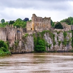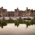 5119uk/ Caernarfon Castle (Castell Caernarfon) reflected in Afon Seiont at sunset, Caernarfon, Gwynedd, Wales