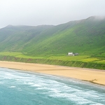 5437uk/ A semi-feral Welsh pony grazing on the cliffs on the Gower Peninsula, with Worm’s Head headland in the background, near Rhossili Bay, Swansea, Wales